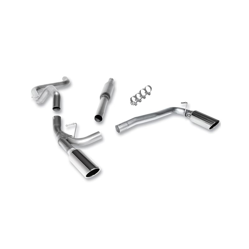 Borla Cat Back exhaust systems use engine-specific (not universal) mufflers that are designed, tested, and optimized specifically for a particular year/make/model vehicle. Borla Cat Back systems increase the overall sound level & performance. Vehicles that don't have a factory service-point require "cutting" the factory exhaust system before installing a Borla Cat Back performance exhaust system. Borla includes instructions where to make this cut and includes the hardware to complete the installation. Many of today's modern vehicles have a factory service-point in the exhaust system (flange or slip-fit) located in the exhaust tubing behind the catalytic converter. A Borla Cat Back performance exhaust system replaces the factory exhaust system (behind this service-point) following the same exhaust path and secured using the original vehicle hangars and rubber isolators. Borla pioneered the automotive exhaust aftermarket in exhausts constructed in aircraft grade 304 stainless steel tubing, a material with higher content of carbon & nickel that won't rust or corrode.