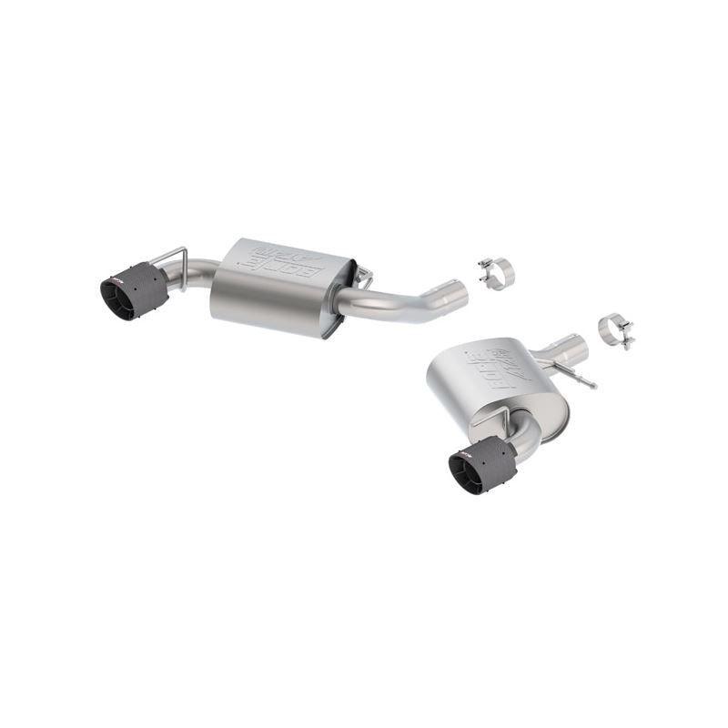 Borla Axle Back systems replace the factory rear mufflers and exhaust pipe with an improvement in overall sound & performance to your truck, SUV, or car. Welded tips are standard on most systems running gas or diesel fuels. Some of today's modern vehicles have a factory service-point in the exhaust system (flange or slip-fit) located in the exhaust tubing behind the vehicle rear axle. A Borla Axle Back performance exhaust system replaces the factory exhaust system (behind this service-point) following the same exhaust path and secured using the original vehicle hangers and rubber isolators.