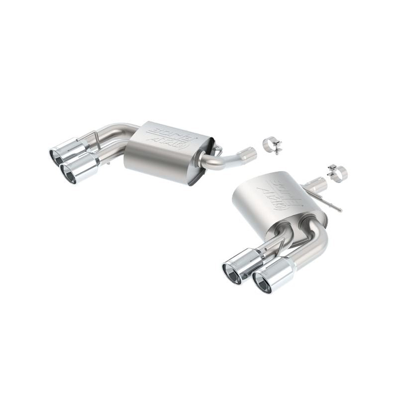 Borla Axle Back systems replace the factory rear mufflers and exhaust pipe with an improvement in overall sound & performance to your truck, SUV, or car. Welded tips are standard on most systems running gas or diesel fuels. Some of today's modern vehicles have a factory service-point in the exhaust system (flange or slip-fit) located in the exhaust tubing behind the vehicle rear axle. A Borla Axle Back performance exhaust system replaces the factory exhaust system (behind this service-point) following the same exhaust path and secured using the original vehicle hangers and rubber isolators.