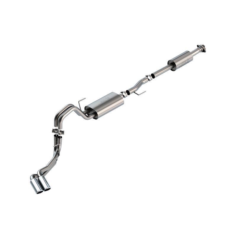 The Borla Cat-Back system 140870 was specifically designed to enhance the power and sound of the Ford F-150 equipped with 2.7L and 3.5L engines. Will NOT fit the 3.5L V6 PowerBoost. It includes bright chromed T-304 stainless steel tips and a dual side exit configuration. The entire system is made of T-304 stainless steel and utilizes computer numerical control (CNC) manufacturing techniques that ensure an accurate fit. This system features the Touring sound level that gives you a mild sound of power with no drone. It is also available with black chromed tips (part number 140870BC). There are also systems available for the 2.7L and 3.5L F-150 that offer different options for sound level, tip finish and tip exits. Add adapter 60556 for Crew Cab Standard Bed (157.2") wheelbase vehicles. Add adapter 60564 for Extended Cab Long Bed (164.1") wheelbase vehicles. All this is backed by our unsurpassed Million Mile Warranty.