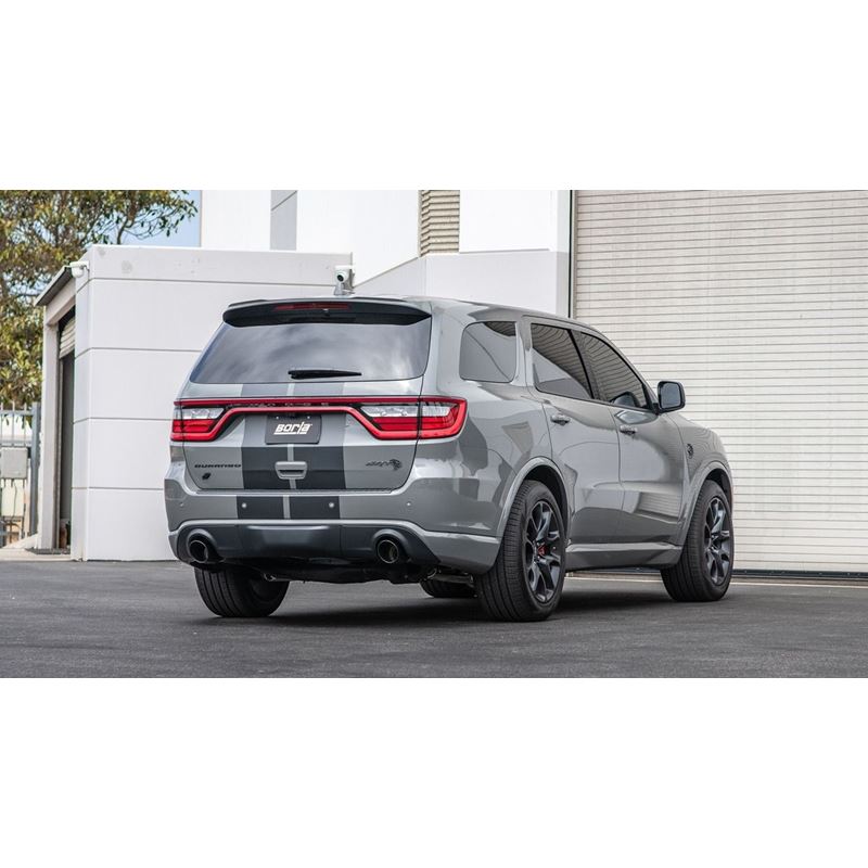 BORLA(r) presents their premium exhaust systems for the Dodge Durango SRT Hellcat. Our Cat-Back(tm) systems were developed and tuned for the supercharged 6.2L HEMI. This system features a merge X-pipe for increased performance and improved sound. Our S-Type sound level delivers a louder and deeper V8 rumble. For a comfortable driving experience, we guarantee No-Drone with our exhaust systems. This Cat-Back(tm) features a dual 3in system diameter with 4.5in T-304 stainless steel tips in a bright chrome finish. All BORLA(r) systems are built with T-304 stainless steel for added durability and long life. Ultra-smooth mandrel bends ensure maximum flow and power, and precision computer numerical control (CNC) manufacturing ensures an accurate fit., All BORLA(r) Cat-Back(tm) and Axle-Back systems are made in the USA and are covered by our Million-Mile warranty., Systerm Features:, Cat-Back(tm) Exhaust System, S-Type Sound Level, No-Drone, 3in Diameter Dual System, 4.5in Bright Chrome On T-304 Stainless Steel Tips, T-304 Stainless Steel Construction, Million-Mile Warranty