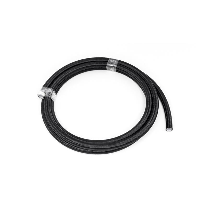 Deatschwerks 8AN Black Nylon Braided PTFE Hose, 10 feet (6-02-0865-10). DW Braided AN Fuel Lines are available in CPE and PTFE, both options are availabe in stainless (silver) or nylon (black) braded coverings. CPE rubber fuel lines are cord reinforced for high pressure and lined for compatibility with ethanol-based fuels up to e85. PTFE fuel lines have increased fuel compatibility for methanol and e100. In addition, The PTFE lines allows tighter radius bends, lower weight, and zero fuel vapor permeability. Swivel hose-end options for both CPE and PTFE in straight, 45, 90, and 180 degrees.