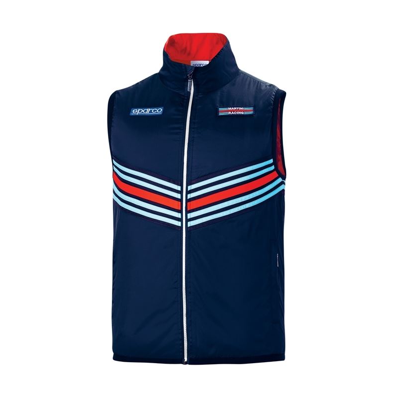 The Martini Replica Vest is made of Ripstop fabric, embroidered with Martini Racing logos and stripes. Features an internal pocket, elastic waist band, special Martini Racing striped zipper flap, and contrast color inner liner.Â
