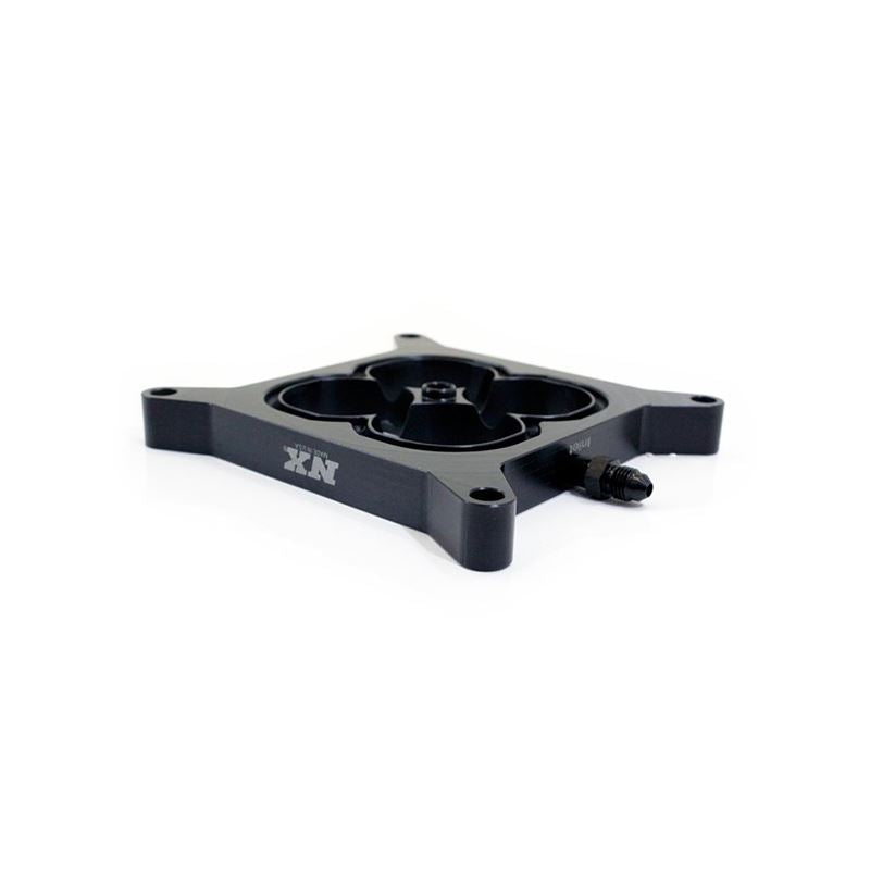 This innovative plate bolts on any manifold that has a 4150 flange on it and allows you to combine the performance and safety benefits of Water Methanol injection with the horsepower and throttle response improvements of a carburetor shear plate. This design places the Water/Methanol Nozzle (not included) in the center of the Carb bores for excellent cylinder to cylinder distribution.