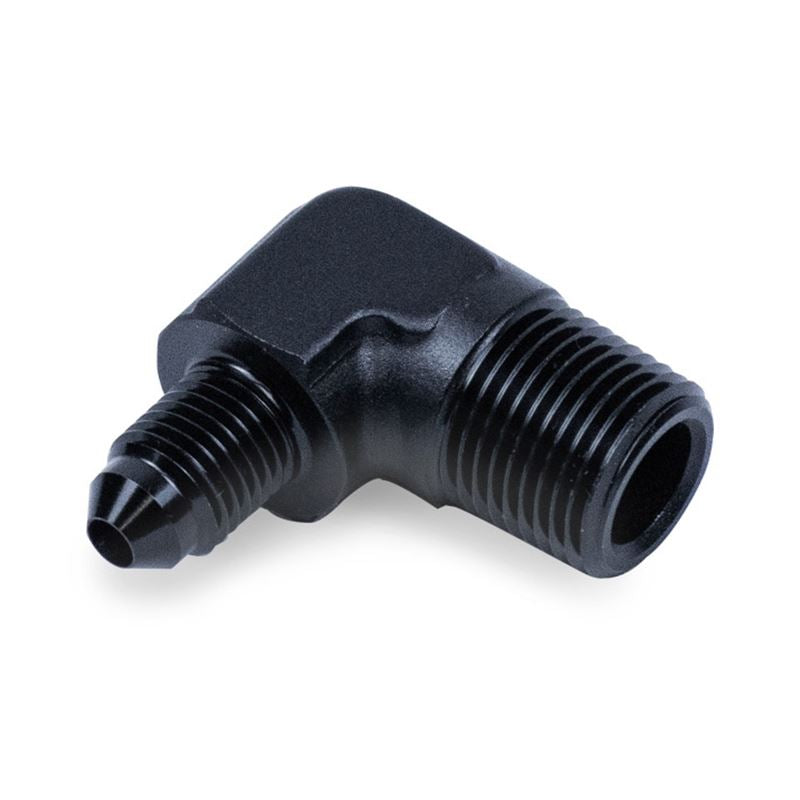 This Snow Performance 3/8" NPT to 4AN Elbow connects your water methanol tank to a 4AN stainless braided line. Anodized, Black for 100% Methanol Resistance.