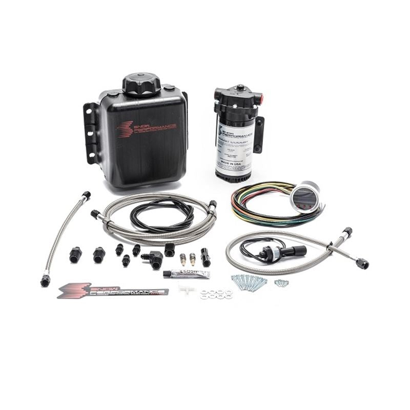 Kit Contents: 300 PSI UHO Pump, 3Qt Tank, Adjustable Progressive VC-50 Controller/Harness, (1) 1', (1) 2', (1) 5' Stainless Steel Braided Line, Boost Line/Required Hardware, Required 4AN Fittings, SP Decal, Self Sealing Level Sensor, Snow Performance Hypersonic-Water-Meth Nozzles/High Flow Check Valve