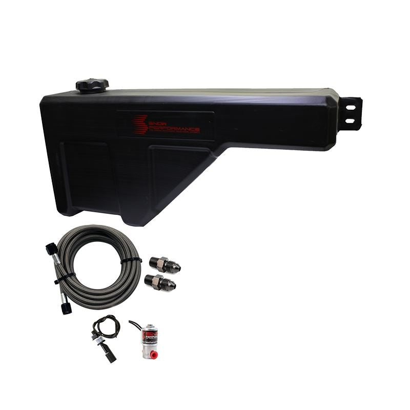 Snow Performance 10 Gallon Tank upgrade is designed for all diesel truck owners looking to carry the maximum amount of water-methanol fluid with out hindering bed space. Custom molded to fit in the void area between the truck bed floor and tire well. Comes complete with a high flow Solenoid, screen fitting, custom straps, and 20' of stainless steel braided line. Designed to go 800+ miles while towing.