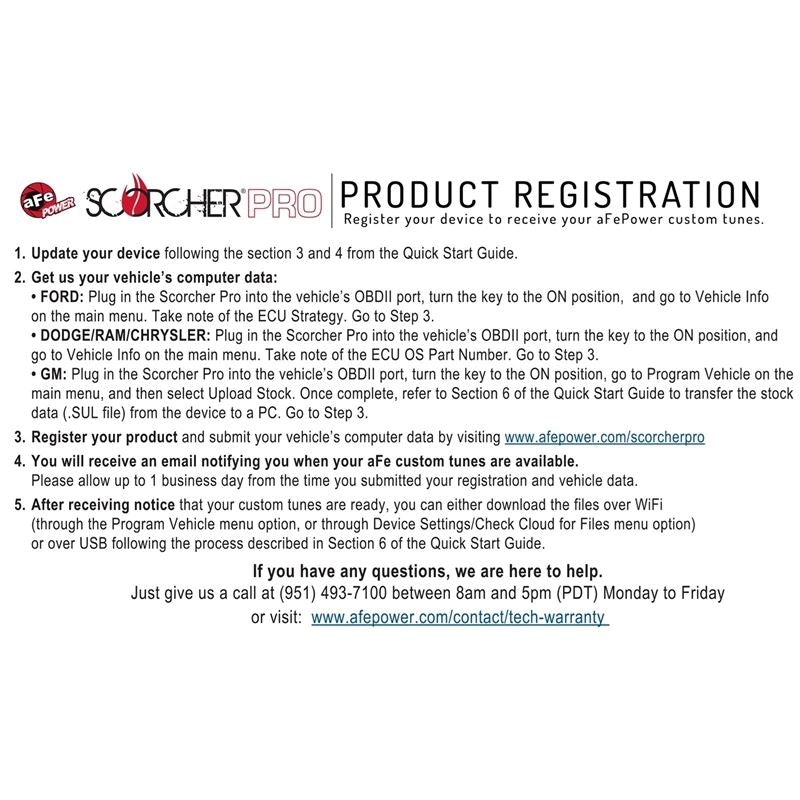 SCORCHER PRO Performance Programmer.If you are looking to maximize your vehicle's performance potential and drivability with a simple download, the aFe SCORCHER PRO Performance Programmer with aFe POWER's custom tunes is for you. The SCORCHER PRO Performance Programmer is an all-in-one, performance programmer that provides specially calibrated tunes for vehicles equipped with aFe POWER products* delivering more horsepower and torque when you need it. With cloud-based tune delivery and built in Wi-Fi capability, you can download aFe POWER's custom tunes whenever or wherever you want it. With its data logging monitoring capabilities, you can display critical vehicle data using full color on-screen, customizable gauges. It's the ultimate in performance enhancements in that it is tailored to fit your vehicles specific modifications and ECU to perform perfectly and produce maximum power gains. The SCORCHER PRO Performance Programmer does not support any changes to your vehicle's emission system. All-in-one, performance programmer that provides specially calibrated tunes for vehicles equipped with aFe POWER products* to maximize your vehicles performance potential and drivability with a simple download. It's the ultimate in performance enhancements. Customized tunes to reprogram your vehicle's ECU to perform perfectly and produce maximum horsepower with aFe POWER products.