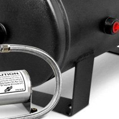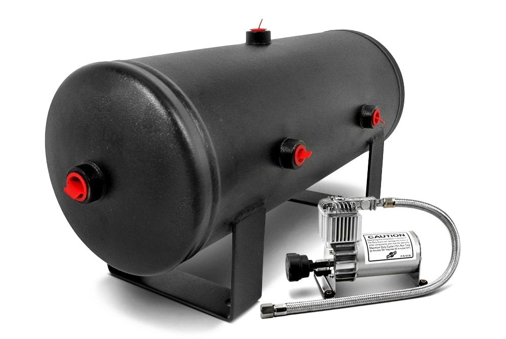 To get the most benefit from your air springs, install an on-board air compressor system. We have complete systems that include the compressor, air springs, air lines and fittings, mounts and hardware, and everything needed for installation, as well as compressor systems that can be used with any brand air springs. Instead of having to find a source of air when you want to pump up your air springs, with an on-board compressor system you can adjust air pressure, and the load support and level of your truck, with the touch of a button. We offer systems that adjust air springs individually or simultaneously, with hardwired control, wireless control with no wires or air lines running into the cab, or automatic control in response to an electronic height sensor.